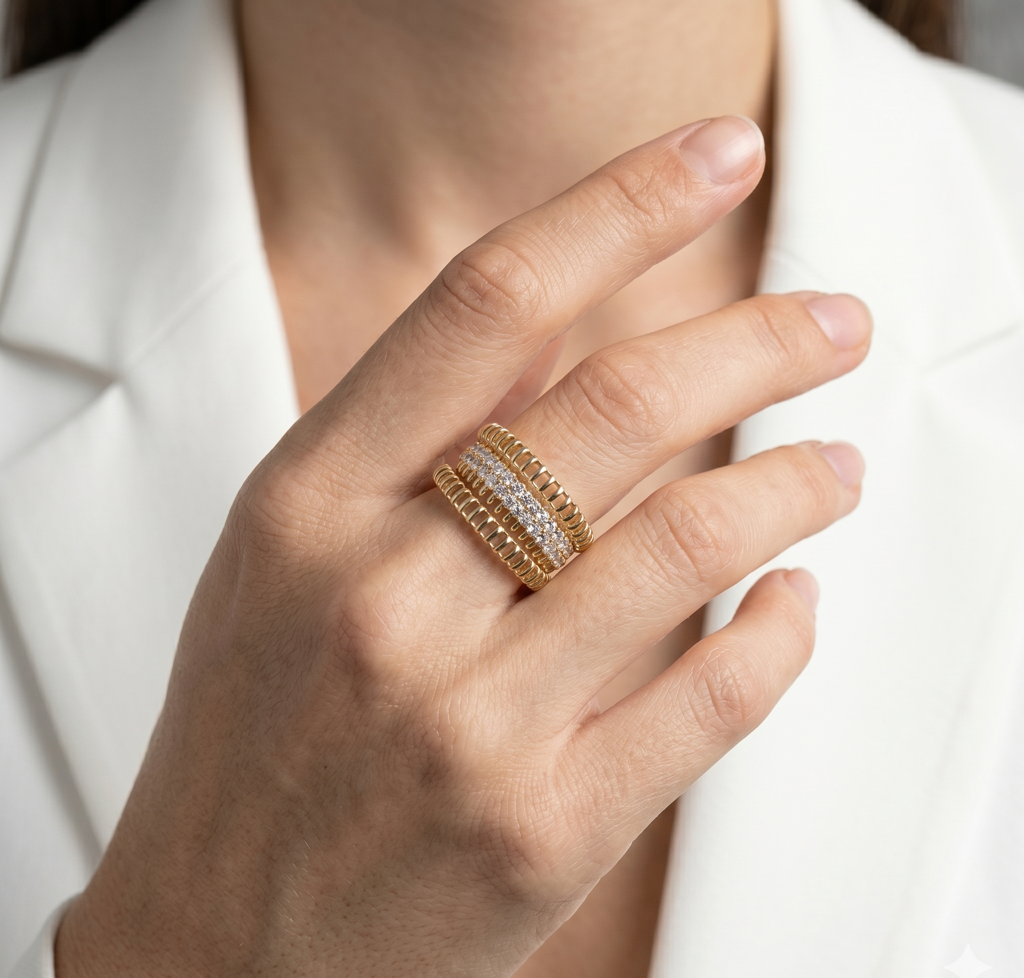 Este anillo está diseñado para la mujer que busca una joyería que refleje su personalidad fuerte y segura. Es perfecto para usarse solo como pieza central (cocktail ring), capturando todas las miradas tanto en eventos de gala como en reuniones de negocios sofisticadas.