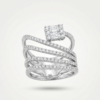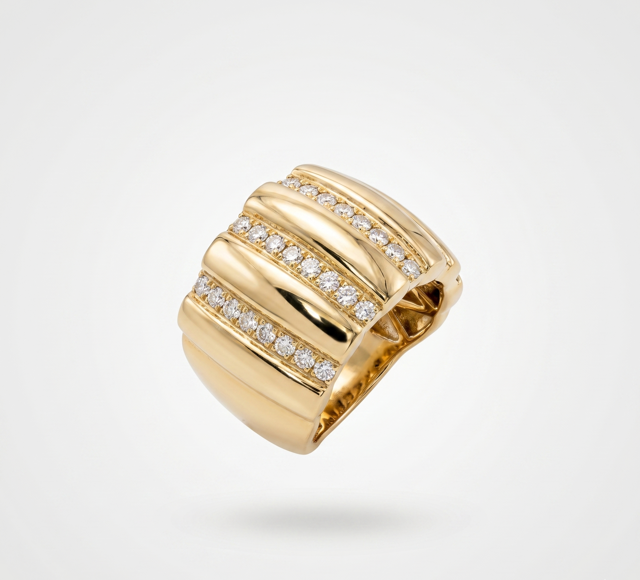El diseño destaca por sus cuatro hileras de diamantes naturales engastados en pavé, alternadas con crestas de oro liso que aportan una textura arquitectónica y una caída de luz inigualable. Es una pieza de joyería fina que combina la robustez de un diseño moderno con la delicadeza del trabajo artesanal.