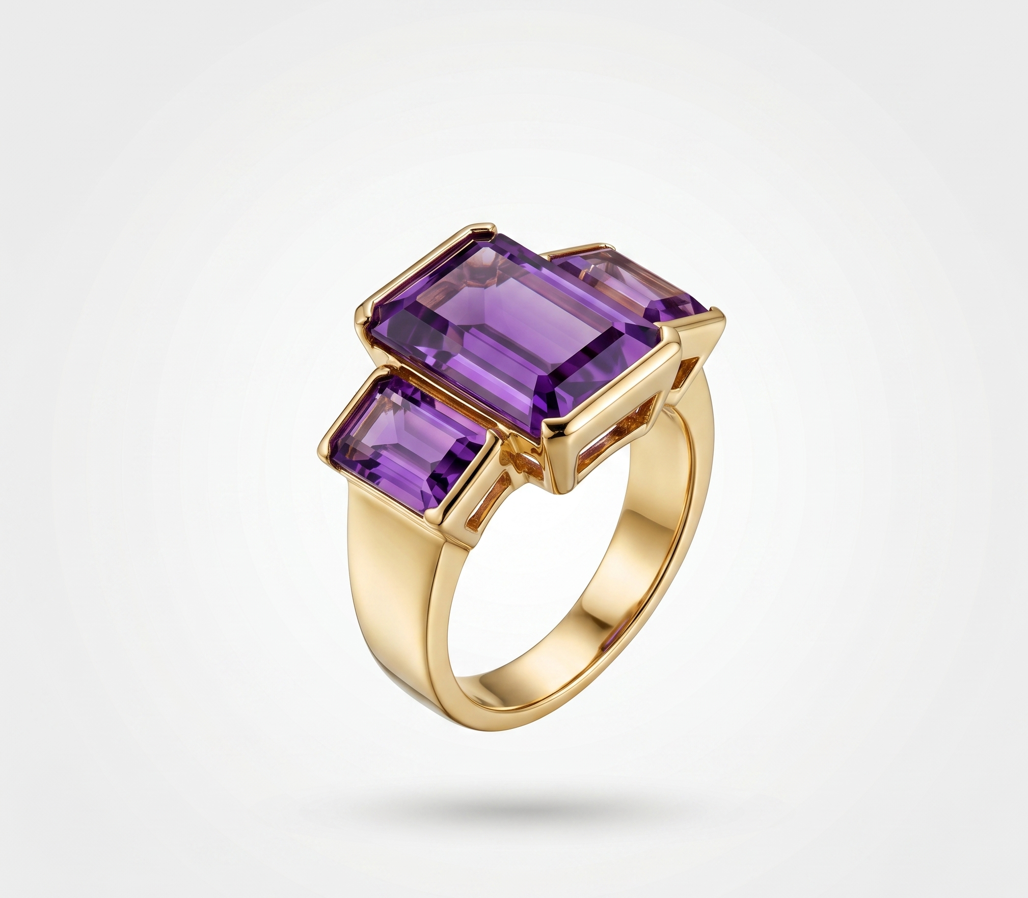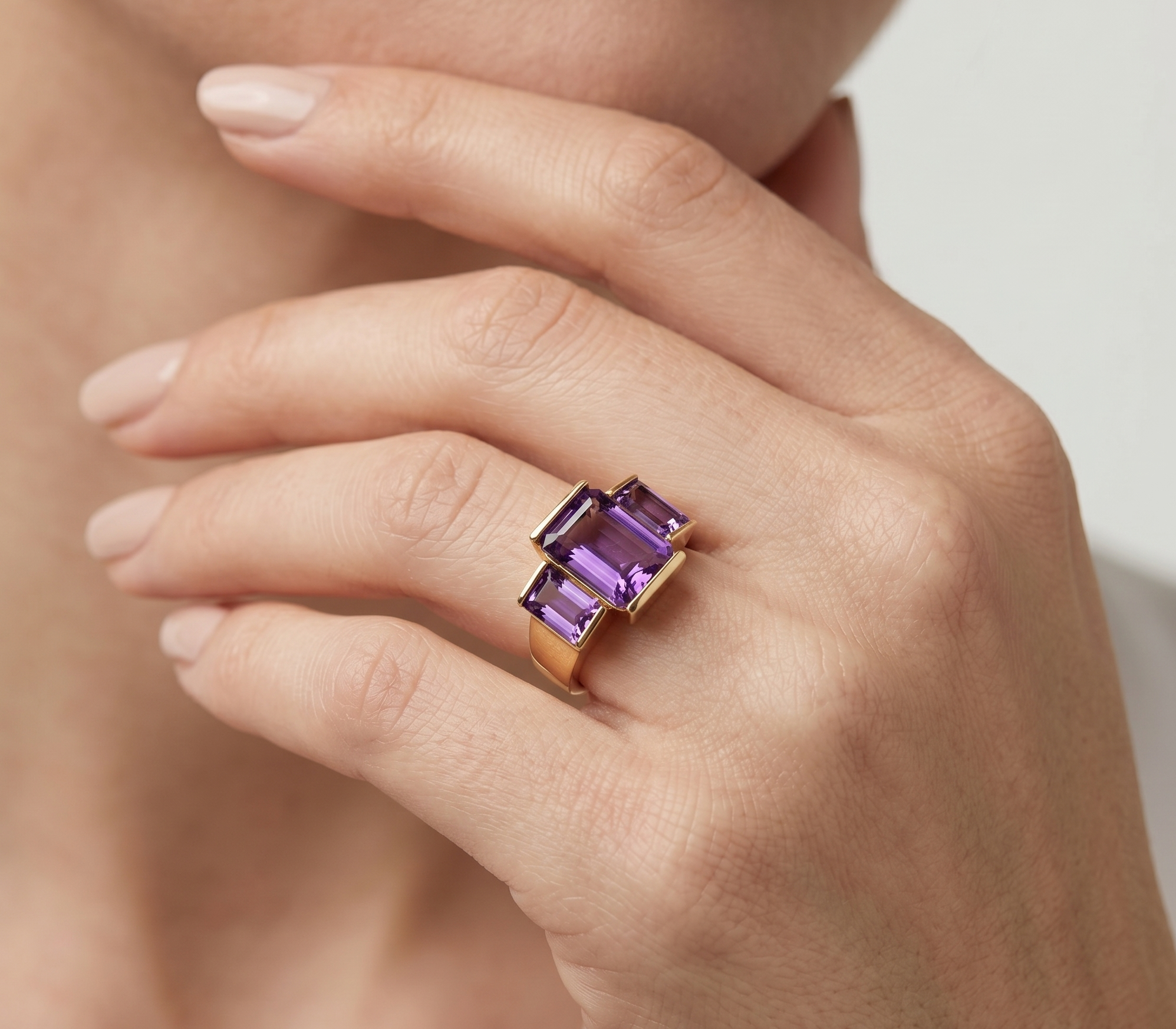 La pieza destaca por su impresionante montaje de tres amatistas en talla esmeralda (rectangular), seleccionadas por su tono púrpura intenso y su claridad excepcional. El engaste robusto en oro amarillo crea un marco de seguridad y contraste cálido que realza los destellos violáceos de las piedras. Es un diseño de joyería fina que combina la fuerza de las líneas rectas con la delicadeza de los reflejos naturales de la gema.