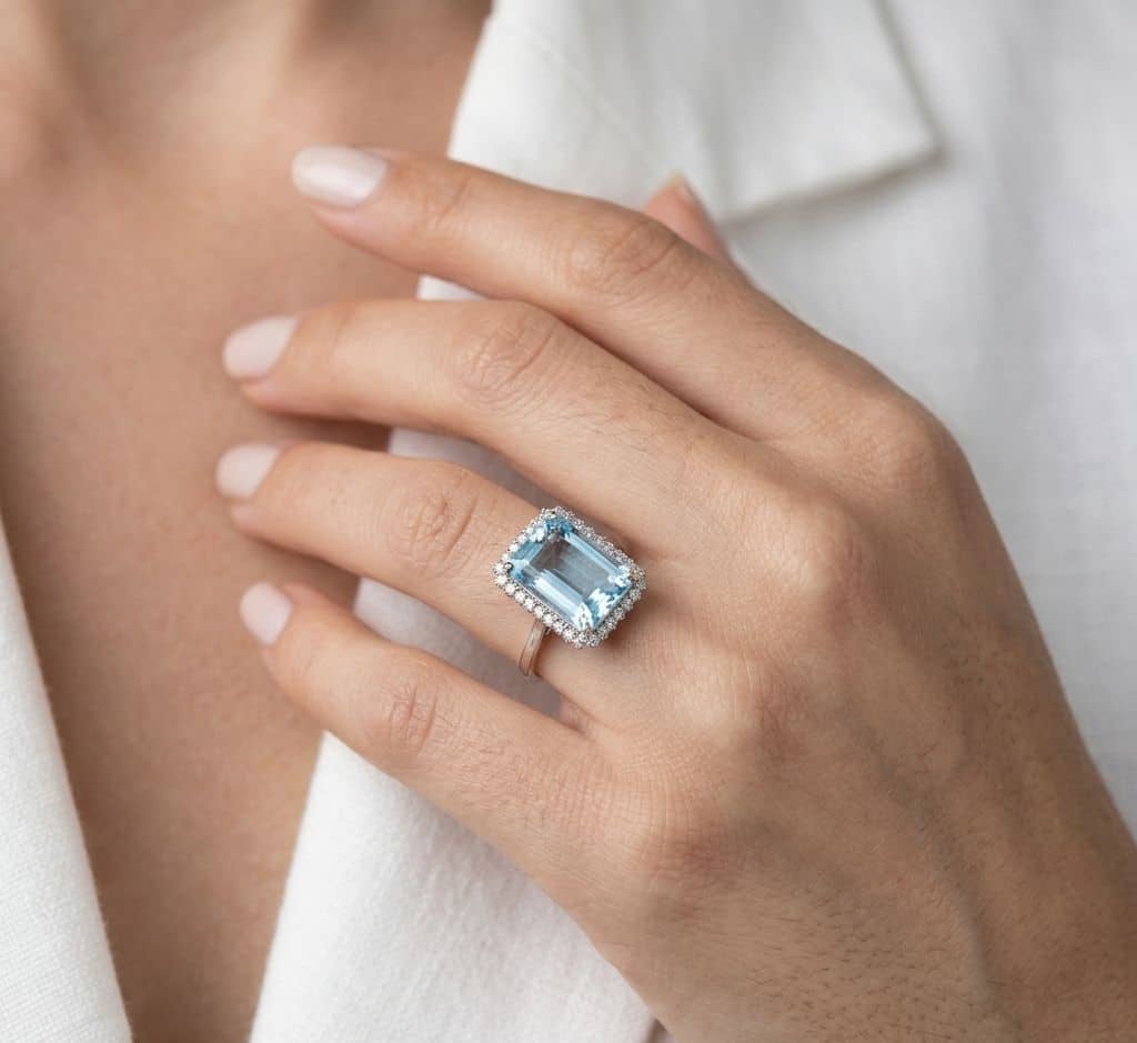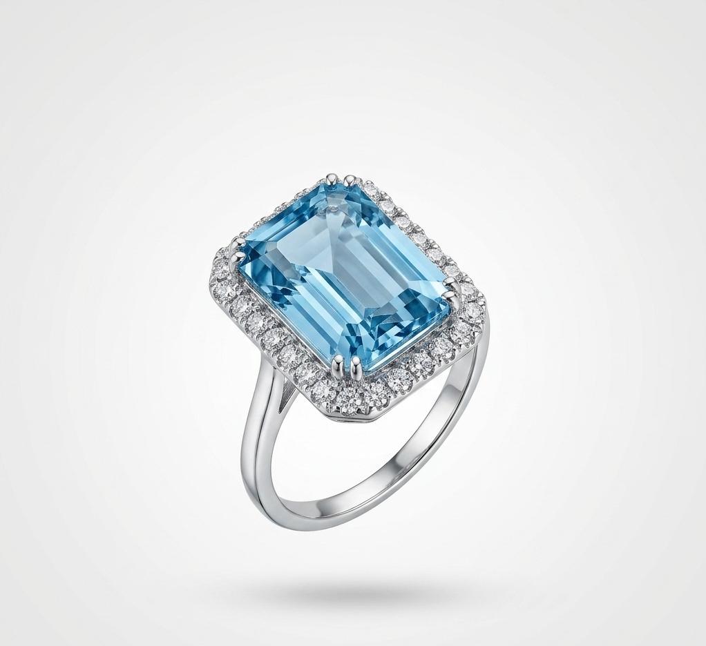 • Piedra Central: Aguamarina natural en corte esmeralda (rectangular).
