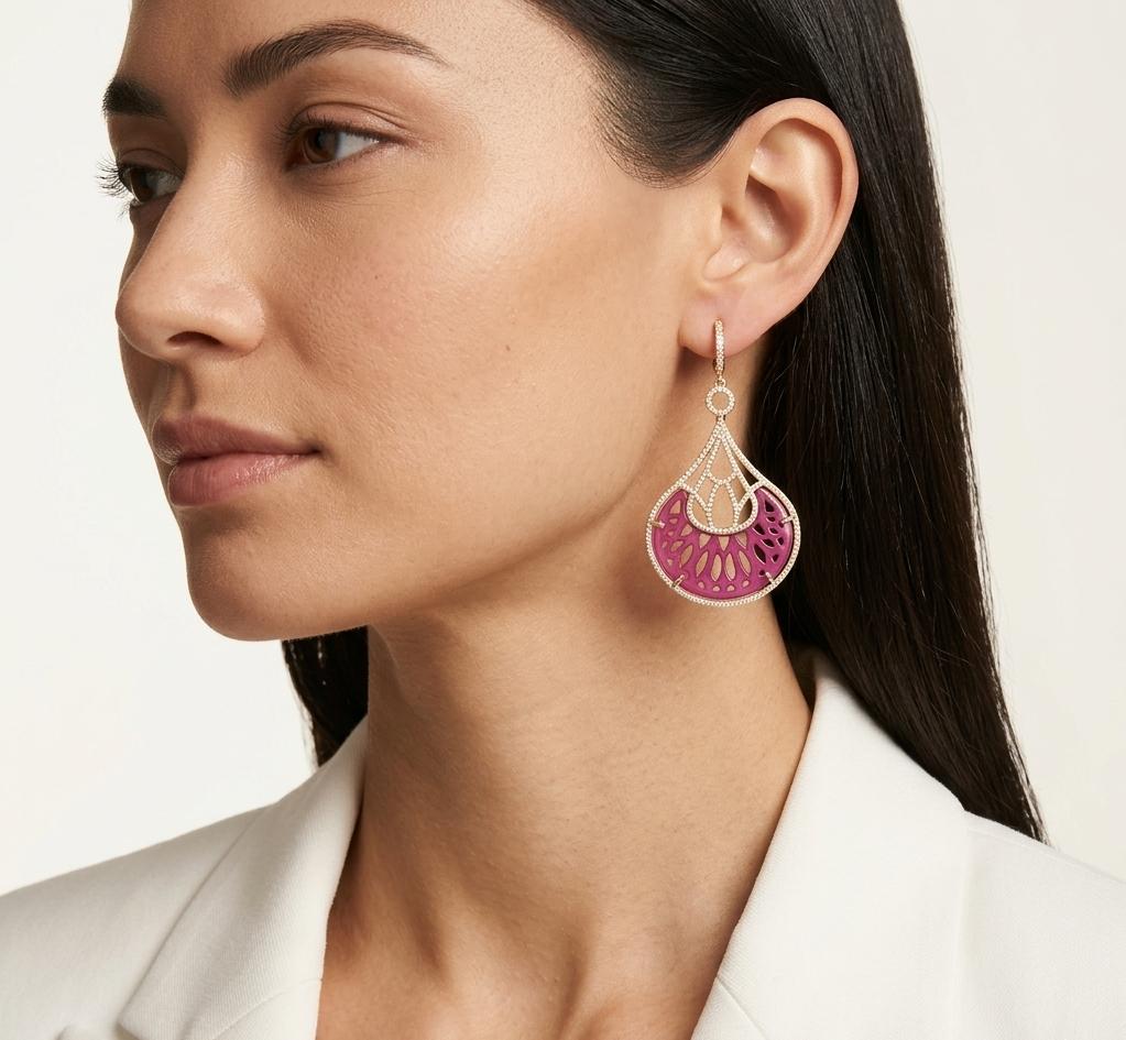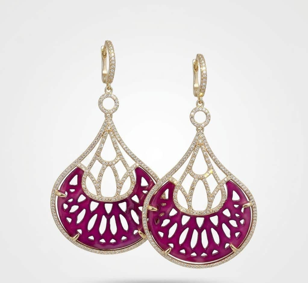 Eleva tu presencia con una pieza que es una verdadera celebración del arte joyero. Estos pendientes no son solo un accesorio; son una «oda a la feminidad audaz», diseñados para la mujer que entiende que el color es el lenguaje del alma. Su silueta de gota estilizada combina la calidez del oro con la intensidad de un tono magenta vibrante, creando un contraste que simboliza la pasión y la sofisticación creativa.