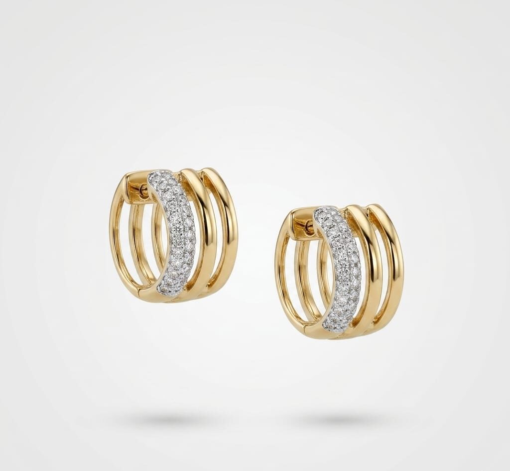 Aretes tipo Argollas de Oro 14K con Diseño de Cuatro Bandas y Pavé | Joyería Fina