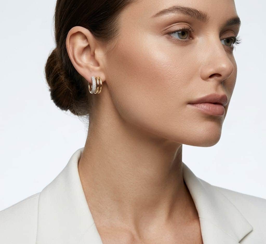 Estos aretes tipo argollas son una pieza de declaración que redefine el concepto de elegancia geométrica. Inspirados en la armonía de las formas paralelas, este diseño crea un efecto visual de múltiples joyas en una sola, aportando volumen y una luz excepcional al rostro. Es el accesorio definitivo para quienes buscan un lujo moderno, audaz y profundamente refinado.