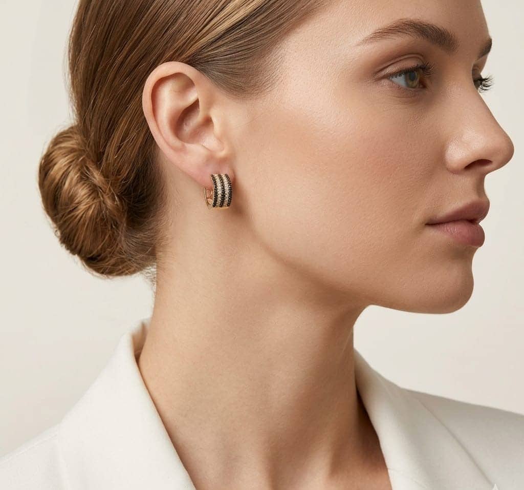 La estructura de estos aretess tipo huggie está fabricados en oro de 14K, proporcionando un cálido marco para las cinco filas de pavé que adornan su frente. Las bandas alternadas de piedras blancas y negras crean un efecto visual rítmico y lujoso. Además, los laterales cuentan con un exquisito calado artístico que permite el paso de la luz, maximizando el destello de las gemas y demostrando una maestría artesanal en cada detalle.