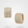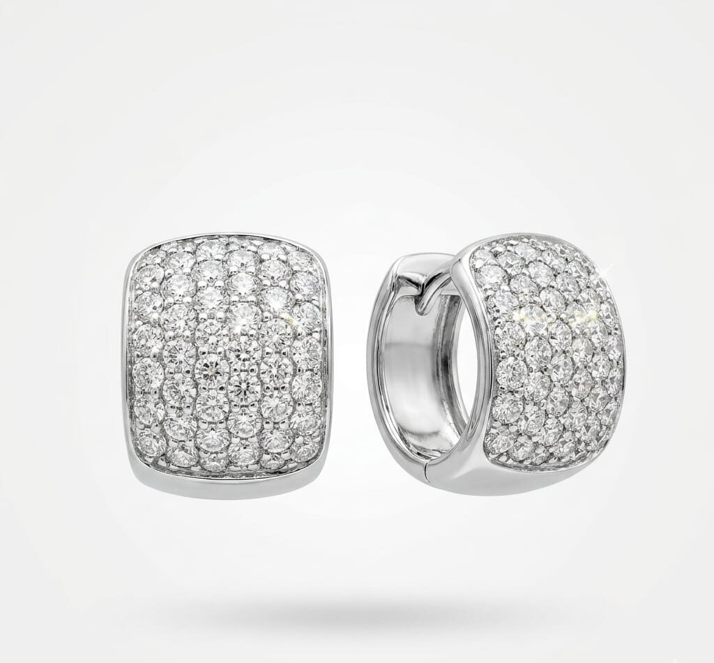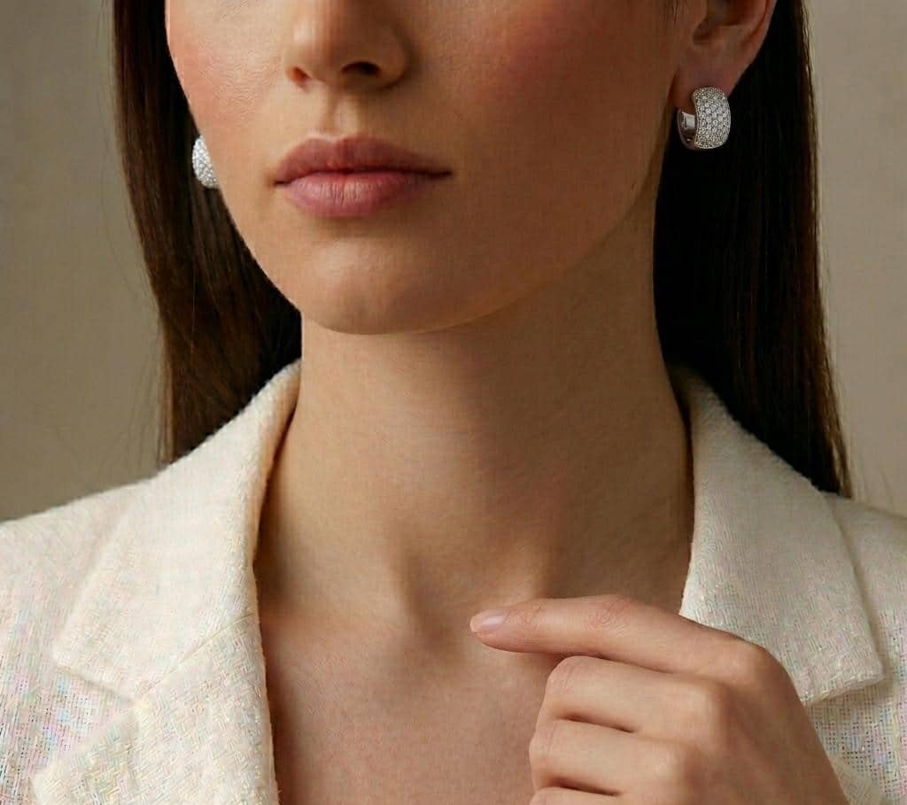 La pieza destaca por su arquitectura fluida de eslabones entrelazados en oro blanco de 14K, logrando un equilibrio perfecto entre volumen y delicadeza. El acabado de alto pulido ofrece un brillo espejo que resalta la sección central, la cual está pavimentada meticulosamente con brillantes que capturan la luz desde cada ángulo. Su diseño ergonómico asegura que luzcan impecables y se mantengan en la posición ideal para iluminar el rostro.