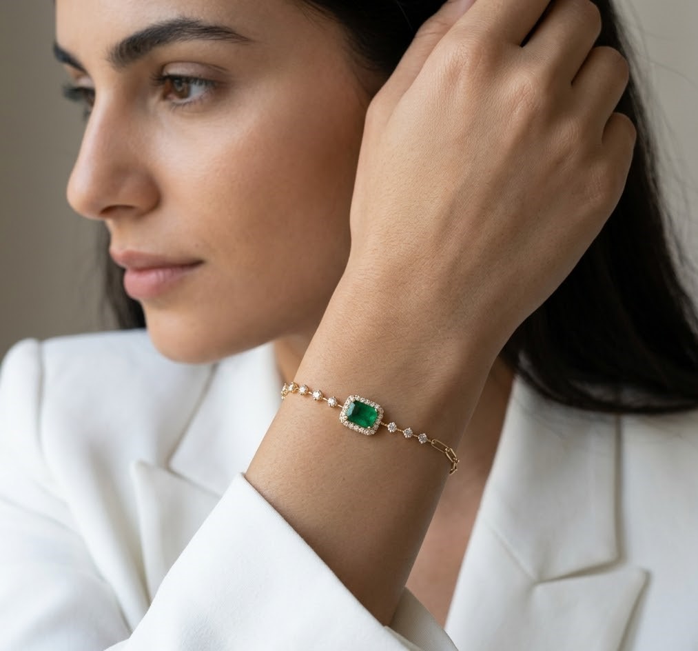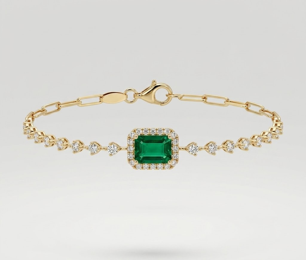 Pulsera de Esmeralda Central y Diamantes en Oro 14K: Lujo Minimalista y Distinción