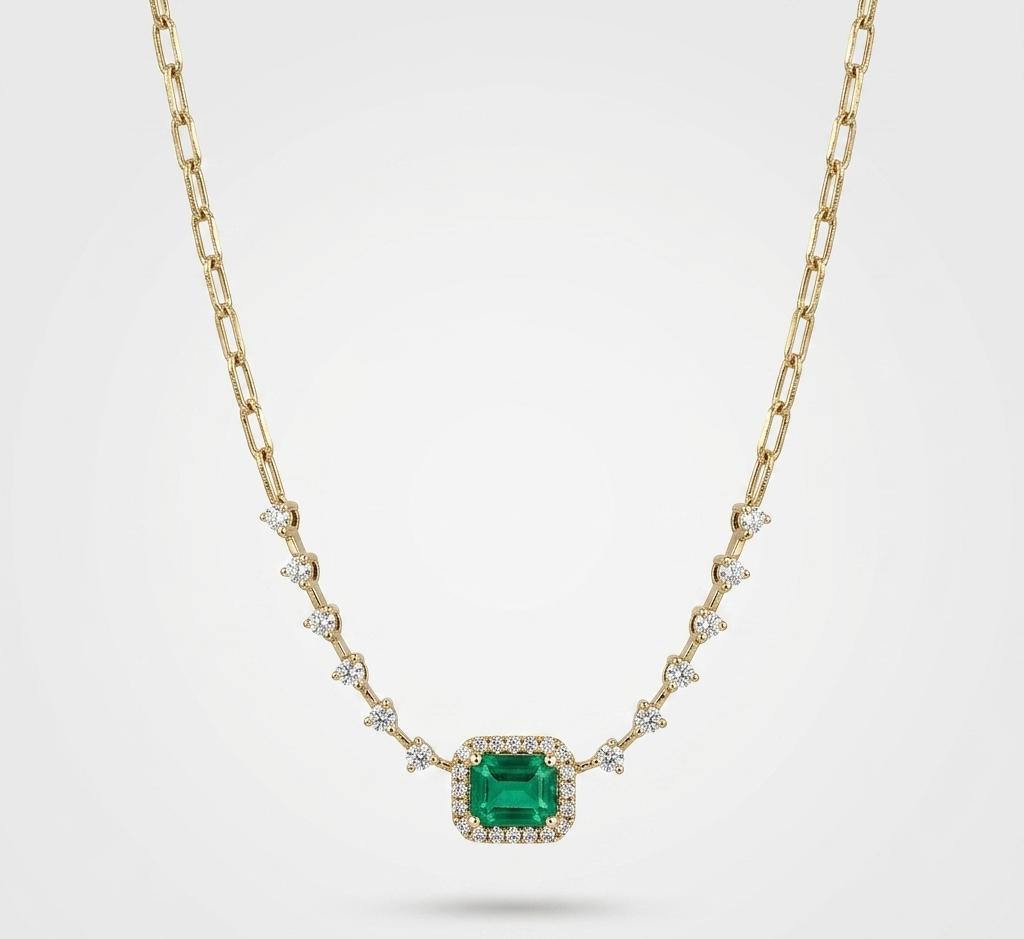 La vibrante energía de la naturaleza en tu cuello. La esmeralda, piedra del éxito y del amor verdadero, es el centro de todas las miradas en esta pieza excepcional. Este collar de oro 14k ha sido creado para la mujer que busca un equilibrio entre la audacia del color y la pureza de los diamantes, simbolizando un renacimiento constante y una elegancia que nunca pasa de moda.
