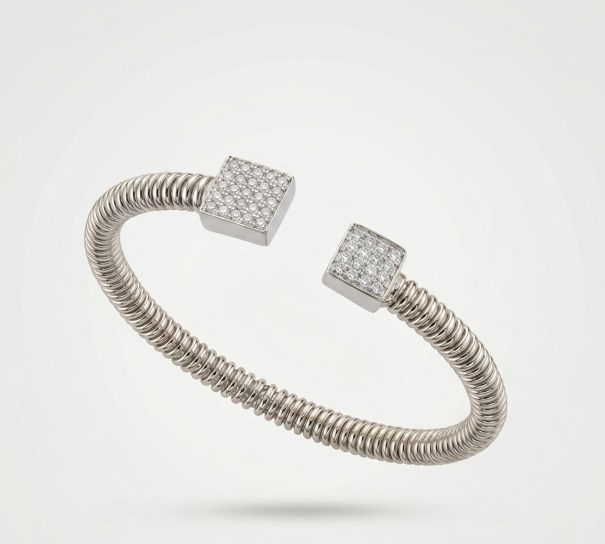 El lujo de la ingeniería joyera. Este brazalete estilo «Gas Pipe» combina la pureza del oro blanco de 18 quilates con un diseño audaz y contemporáneo. Es la pieza definitiva para quienes buscan un accesorio que proyecte fuerza, sofisticación y un brillo ininterrumpido a través de su geometría perfecta.