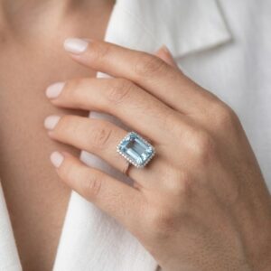 Anillo de Oro Blanco 14K con Aguamarina y Halo de Diamantes!